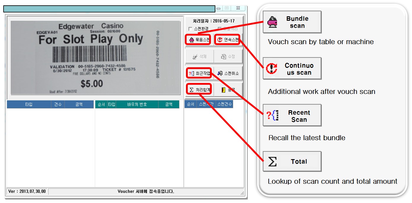 SB-3000 может также обрабатывать TITO (билеты, ваучер). Во-первых, он сканирует и подтверждает идентификатор игрового автомата и сумму. Во-вторых, он отправляет отсканированные изображения и идентификатор игрового автомата, сумму и т. д. (Настраивается по запросу) на ПК. В-третьих, ПО TITO (на ПК) хранит ваучерные изображения с анализированной информацией. Наконец, ПО TITO (программа для ПК) может отправить информацию на сервер ваучера.