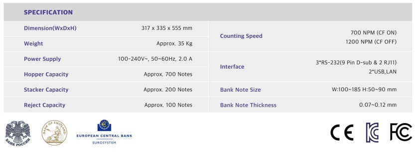 Это пятикарманный сортировщик банкнот по ветхости. Новое поколение блока детекции - одновременная двусторонняя проверка видимого и ИК образов в отраженном свете и на просвет. Определение банкнот со скотчем, сравнение серийных номеров банкнот с контролем подлинности в 4 ориентациях. Протестирован и рекомендован ЦБ Республики Узбекист и РФ.