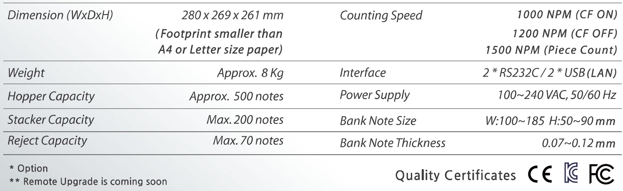 - Различные режимы счета: смешанный / одиночный / счетчик / лицо / ориентация / (Issue / SRL / P-OCR) - расширенное обнаружение контрафакта: многоканальный УФ / МР (обнаружение металлической нити) / инфракрасный / 3D-определение размера / обнаружение MG